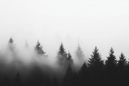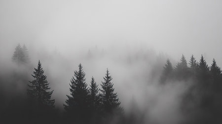The silhouette of tall pine trees in thick fog creates a tranquil atmosphere, inspiring deep emotions in this picturesque minimalist landscape, leading one to gaze and get lost in thought