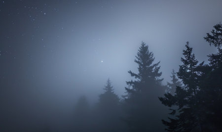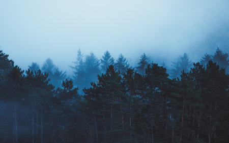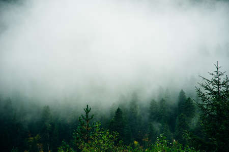 Blurry view to conifer forest inside low cloud. Dense fog among silhouettes of coniferous trees. Dark forest in haze. Ghostly atmospheric mountain landscape in foggy woodland. Hipster, vintage tones.