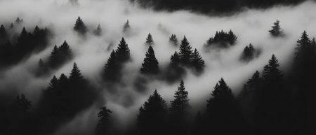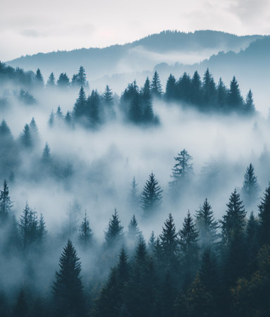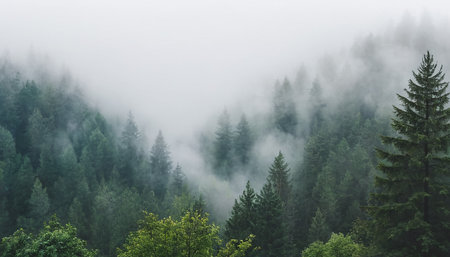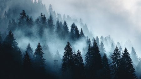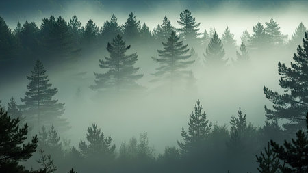 A captivating misty morning scene showcasing a dense evergreen forest enveloped in soft fog, creating an atmospheric and serene backdrop for nature lovers.