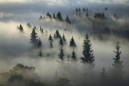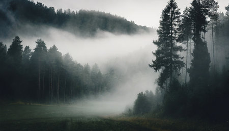 Mysterious thick fog swirling around dense forest at dawn accentuates the atmospheric allure