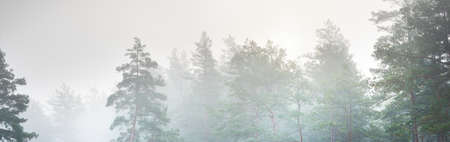 Foggy morning in the coniferous forest, panorama