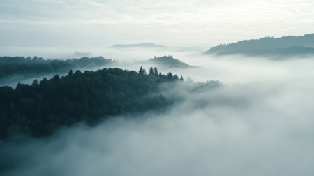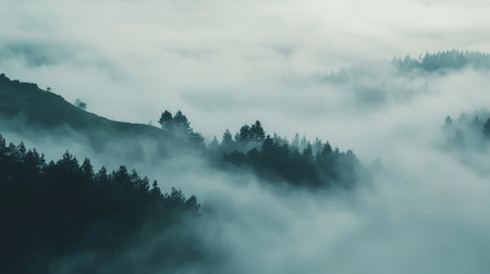 Captivating misty landscape with layered forests and atmospheric fog rolling over the hilly terrain This serene and ethereal scene evokes a sense of mystery tranquility