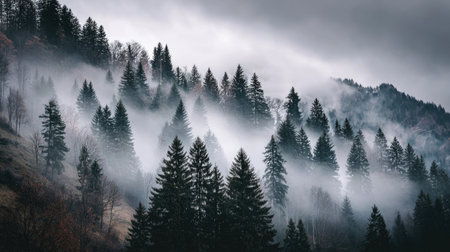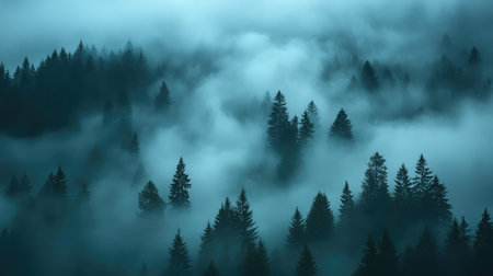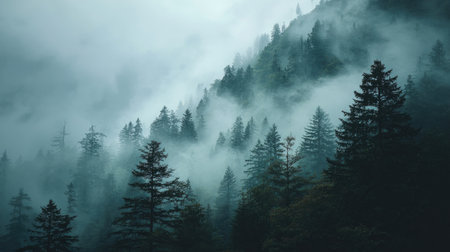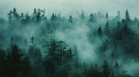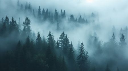 This atmospheric image depicts a misty forest with evergreen trees shrouded in fog, creating a tranquil and serene environment that showcases nature's untamed beauty.