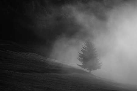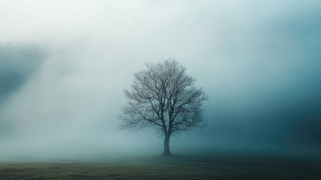 lone tree standing in a foggy landscape, with mist swirling around its branches, creating a mysterious atmosphere