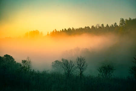 A beautiful misty morning in the river valley. A springtime sunrise with fog at the banks of the river over trees. Spring landscape in Northern Europe with mist and trees.