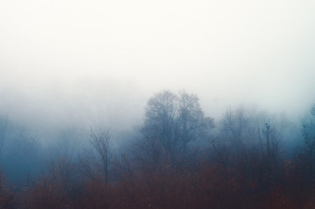 Autumn dense fog. Silhouettes of trees in the haze of the forest. Mood of serenity, loneliness and peace