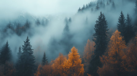 Explore a stunning mountain landscape where mist and fog envelop the serene wilderness, highlighting the beauty of pine trees and autumn colors.