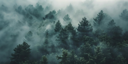 A panoramic view of a dense pine forest shrouded in mist, showcasing the ethereal beauty of nature.