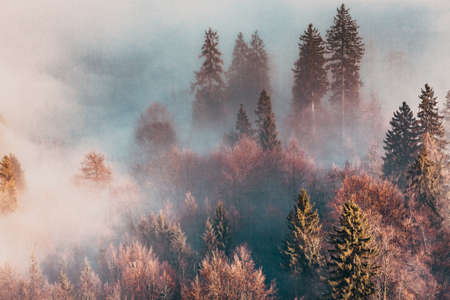 beautiful foggy mystic mountains. Fog clouds at the pine tree mystical woods, morning. Europe, mysterious alpine landscape.