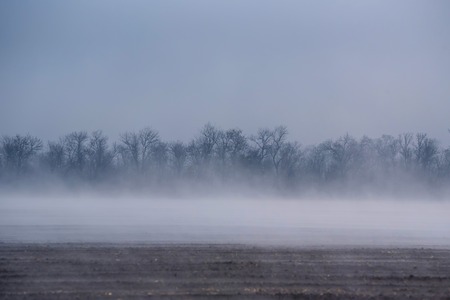 Foggy morning in the winter forest. Trees in the fog.
