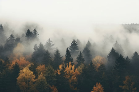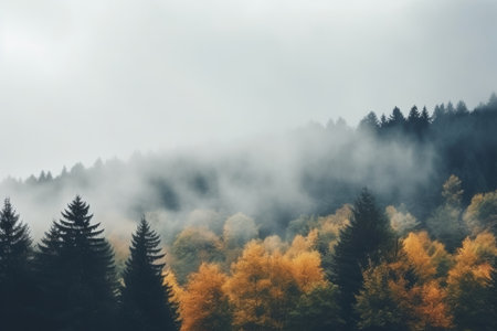 Misty morning in a forest with evergreen trees and autumn foliage during early hours
