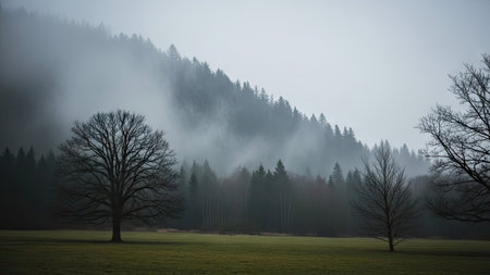 A tranquil image portrays a forest landscape shrouded in atmospheric fog. The composition includes bare trees in the foreground, with a densely forested hillside receding into the distance. The scene is dominated by muted greens and grays, suggesting a cool, overcast day, suitable for various editorial and commercial applications.