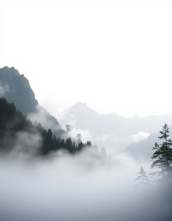 Captivating Misty Landscape with Towering Mountains and Dense Evergreen Forest Shrouded in Ethereal Fog