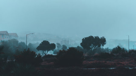 A tranquil foggy landscape captures the beauty of mist-covered trees and distant buildings, evoking serene feelings of stillness and peace in nature.