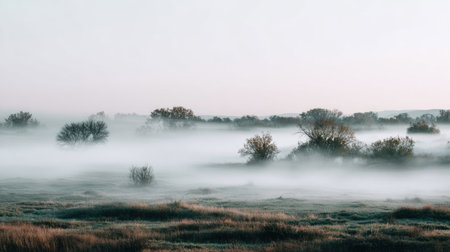 A peaceful morning scene featuring soft mist gently enveloping the landscape, with silhouetted trees and tranquil grasses under a pale dawn sky.