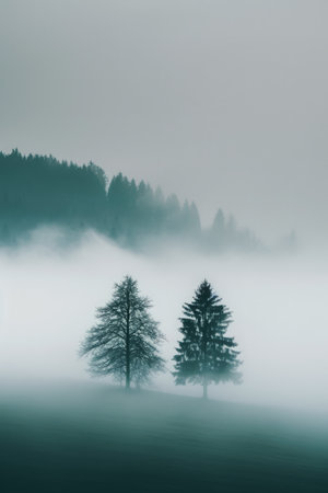 A beautifully tranquil forest scene featuring the silhouettes of tall pine trees that are enveloped in a blanket of thick fog, creating a serene, peaceful, and emotionally touching atmosphere for all