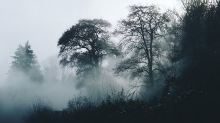 A captivating view of silhouetted trees shrouded in fog creates a serene and mysterious atmosphere, perfect for nature lovers and outdoor enthusiasts seeking tranquility.