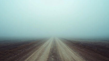 A picturesque dirt road leads into a thick fog, creating a sense of mystery and solitude. The surrounding landscape is quiet, enhancing the feeling of peace and tranquility.