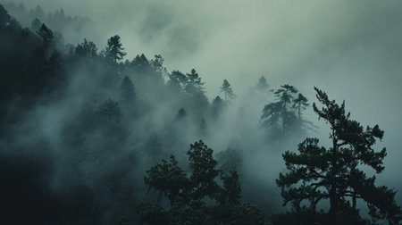 Captivating view of a mist-covered mountain landscape filled with dense pine forests, creating an atmosphere of tranquility and mystery in a natural setting.