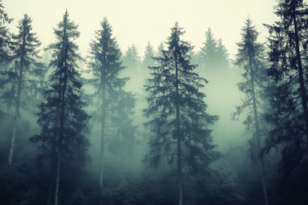 An atmospheric landscape features tall evergreen trees shrouded in thick fog. The scene is dominated by shades of green and gray, with soft lighting and a blurred background. Suitable for a variety of uses including environmental, travel, and natural beauty themes.