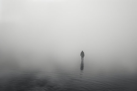 AI Generated. Silhouette of a Person in a Foggy Landscape