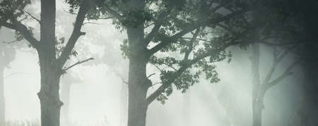 Amazing mystical rising fog forest trees landscape in black forest (Schwarzwald) Germany panorama banner - dark mood