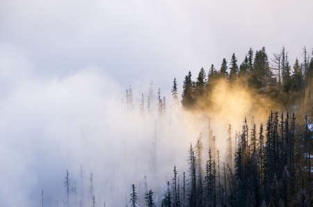 Misty forest in the mountains. Beautiful landscape with coniferous forest.