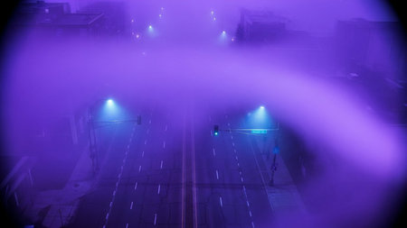 showing aerial view of a city street at night shrouded in thick purple fog with glowing streetlights and...