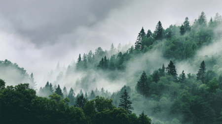 A captivating misty forest landscape featuring lush green trees and a blanket of fog. This scenic view evokes tranquility and a connection to nature's beauty.