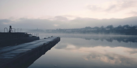 Misty morning at a tranquil river dock
