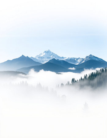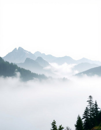 Misty mountains shrouded in fog, creating a serene and mysterious atmosphere.