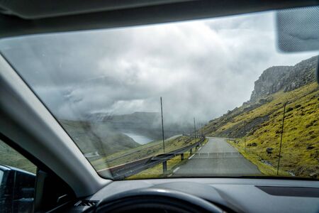 Driver's perspective from the inside of a car during a road trip through snow-covered valleys on the Faroe Islands.