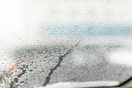 Drops flow down the windscreen. Inside view of a windshield car. Dark black cinematic picture. Process stage of polishing and washing a auto. Movement zoom camera dolly shooting platform.