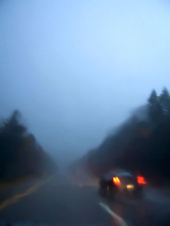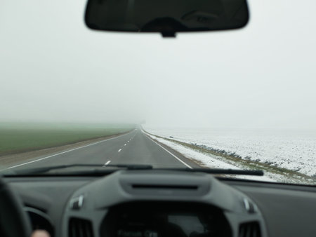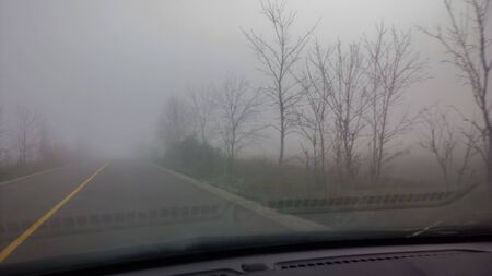 Bad weather driving with low visibility in winter. Thick fog on the road