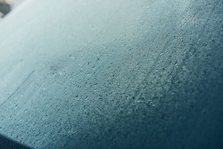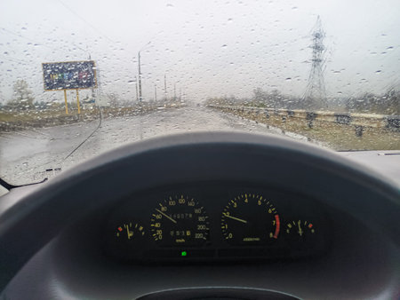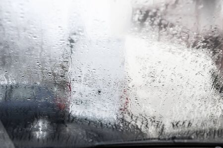 raindrops on the glass of the car. drive the car to the door. travel in bad weather. driver behind the wheel.