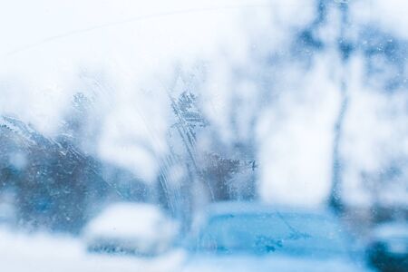 Frozen windscreen and windshield wipers totally covered with ice, caution, poor view causes dangerous driving im winter, traffic background with copy space, selective focus