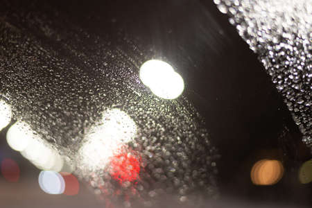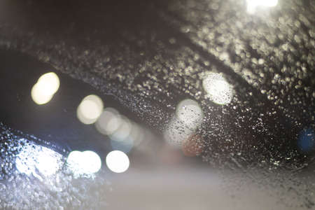 Cars in traffic in winter in the evening dark or at night. View through the windshield, covered with water drops. Blurred view