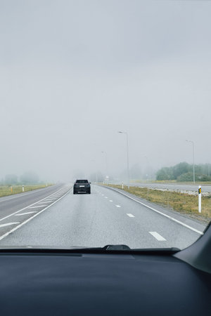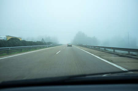 View through windshield from driving auto in highway on foggy day.Poor road visibility.Cloudy gray weather. View from passenger seat to moving oncoming traffic, bump stop,asphalt, white dividing line