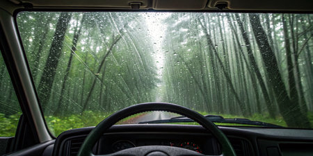 Driving along a narrow road in a lush green forest, thick trees rise on either side. Raindrops bead on the windshield, creating a serene, misty atmosphere.
