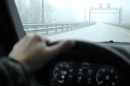 Thick fog blankets morning highway, fog limiting visibility beyond rolling horizon, fog compelling slower speed for safer commute, urging mindful driving under gray swirl, demanding caution