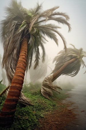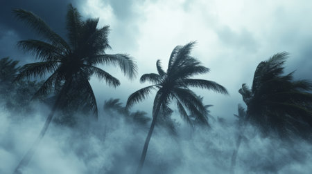 Heavy rain and strong wind are shaking palm trees in a tropical storm, creating a dramatic and dangerous atmosphere with low visibility due to fog and mist