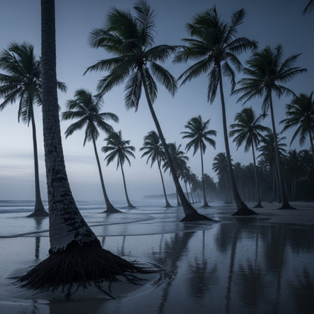 A tranquil beach scene featuring slender palm trees rising from the black sand under a blanket of mist, creating a serene coastal atmosphere.