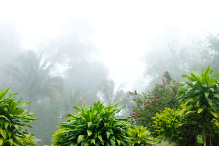 Foggy scenery rises from tall betel trees, coconut tree, and gray sky, with nature morning background concept.