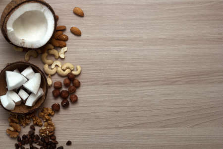 nuts on the table, top view, copy space