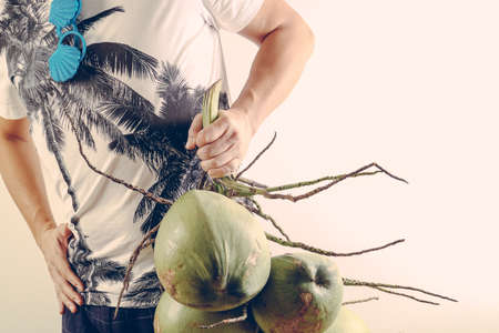 Summer and holiday fashion concept.Man Wearing palm trees graphics on T-shirt and holding cluster of coconuts with items on white background