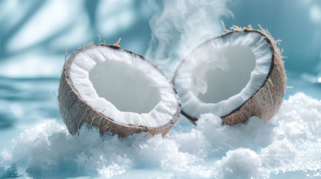 Two fresh coconut halves surrounded by frost and gentle steam on a cool blue background. Ideal for themes of freshness, tropical fruit, and exotic flavors.