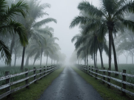 AI Generated. Lush Sugar Cane Plantation Pathway in Fog