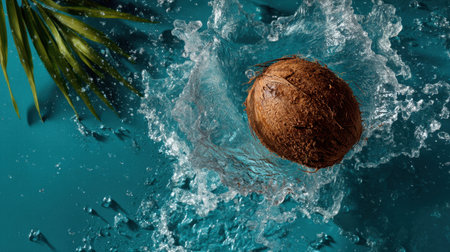 A coconut is splashed into shimmering water, creating dynamic waves against a vibrant turquoise backdrop. The image evokes a refreshing summer feeling with a touch of tropical leaves, perfect for showcasing nature's beauty and healthy living.
