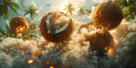 A bunch of coconuts is seen flying through the air as if they are exploding, showcasing dynamic motion and force.