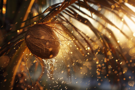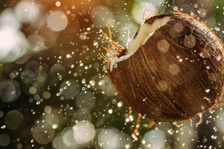 A coconut is falling from a tree and is surrounded by water droplets. The scene is serene and peaceful, with the coconut gently floating down to the ground
